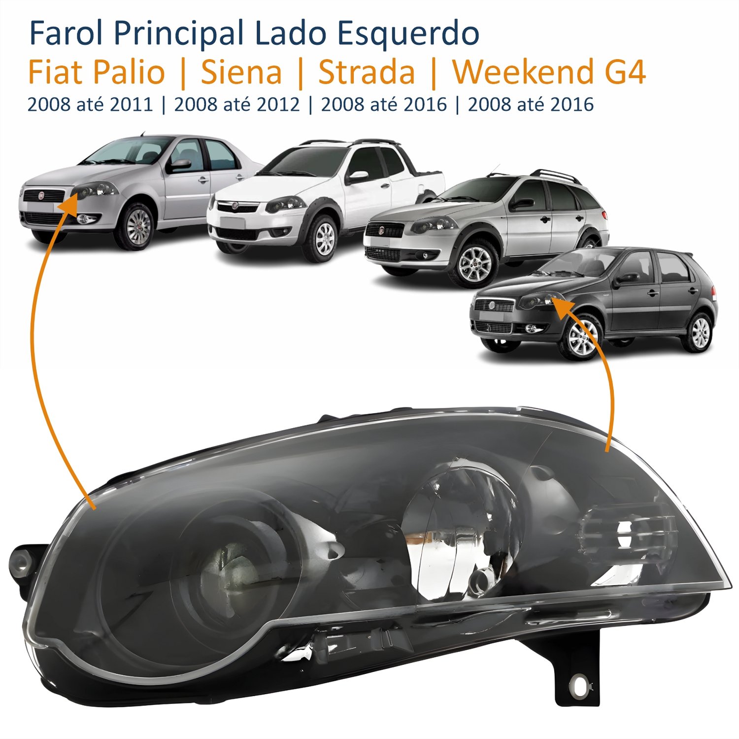 Farol Fiat Palio Siena Strada Weekend G4 2008 Até 2016 Foco Duplo Máscara Negra com Anel Preto Lado Esquerdo Motorista