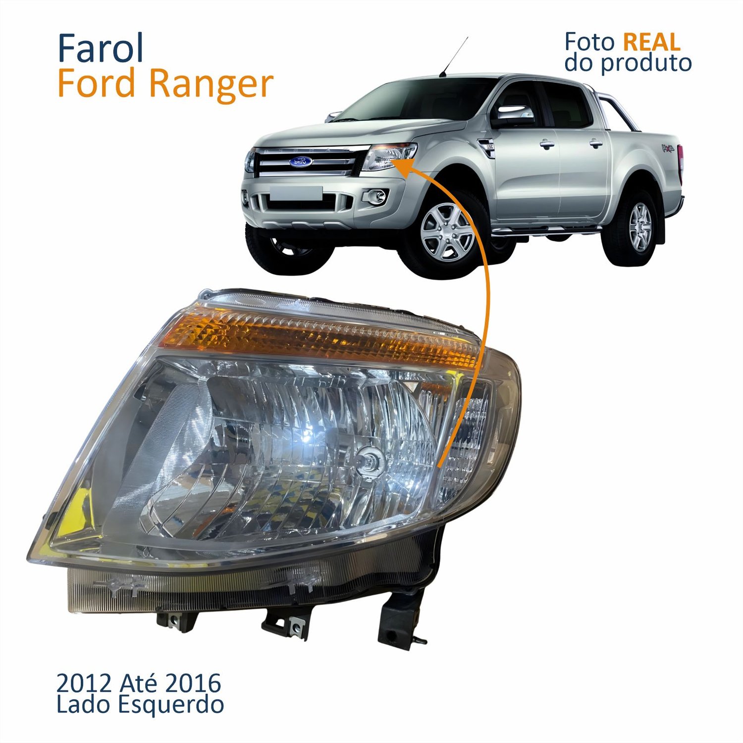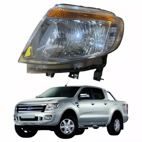Farol Principal Ford Ranger 2012 Até 2016 Máscara Cromada Pisca Âmbar Com Motor Lado Esquerdo Motorista