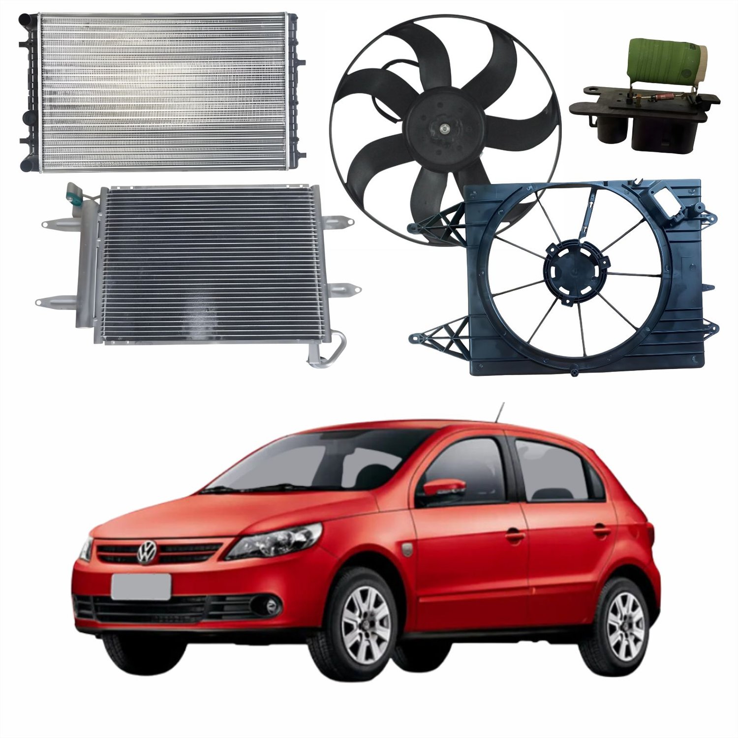 Radiador Vw Gol Voyage Saveiro 2009 Até 2023 Fox Spacefox Polo 2006 Até 2018 Com Ar Condicionado Mecânico Quant: 1xDefletor Ventoinha Vw Fox Spacefox Polo 2006 Até 2012 Gol Voyage Saveiro 2009 Até 2021 Com Ar Condicionado Original Quant: 1xEletroventilador Vw Gol Voyage Saveiro 2009 Até 2023 Fox Spacefox Polo 2006 Até 2023 Com Ar Quant: 1xResistência Eletroventilador Vw Fox Crossfox Spacefox Polo 2006 Até 2012 Gol Voyage Saveiro 2009 Até 2021 Com Ar Condicionado Quant: 1xCondensador Vw Gol Voyage Saveiro 2009 Até 2023 Fox 2011 Até 2014 Polo 2002 Até 2015 Quant: 1x