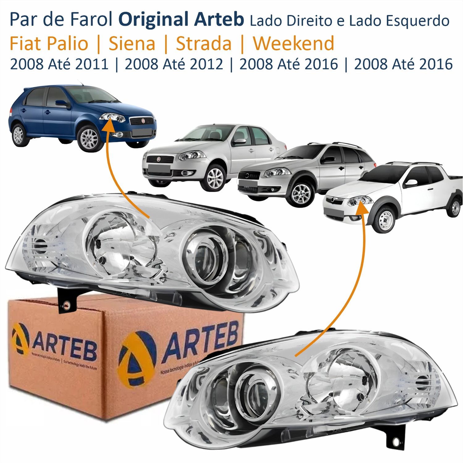 Par de Farol Fiat Palio 2008 Até 2011 Siena 2008 Até 2012 Strada Weekend 2008 Até 2016 Original Arteb Máscara Cromada Com Anel Cromado