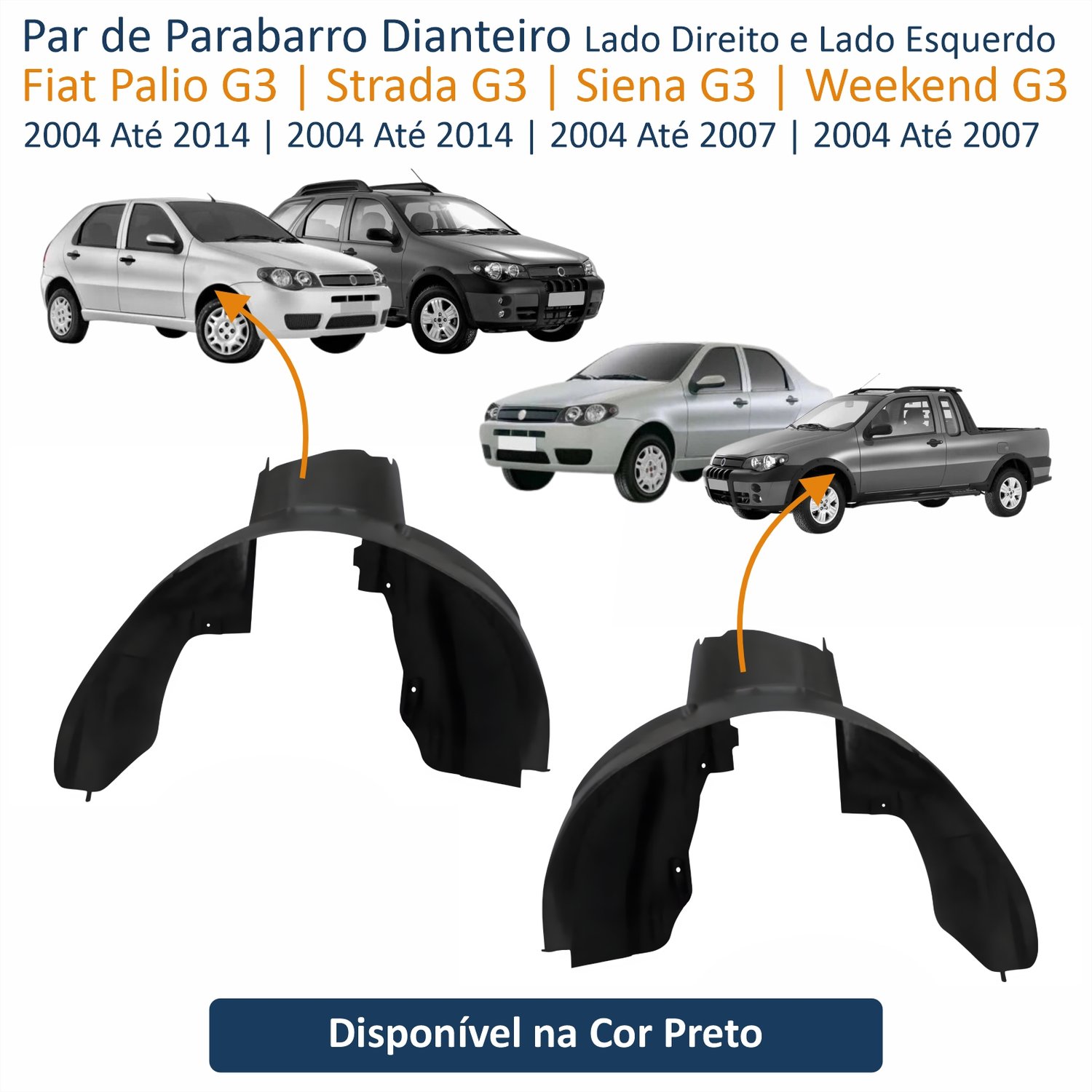 Parabarro Dianteiro Fiat Palio Strada G3 2004 Até 2014 Siena Weekend G3 2004 Até 2007 Lado Direito PassageiroTamanho: ÚnicoParabarro Dianteiro Fiat Palio Strada G3 2004 Até 2014 Siena Weekend G3 2004 Até 2007 Lado Esquerdo MotoristaTamanho: Único