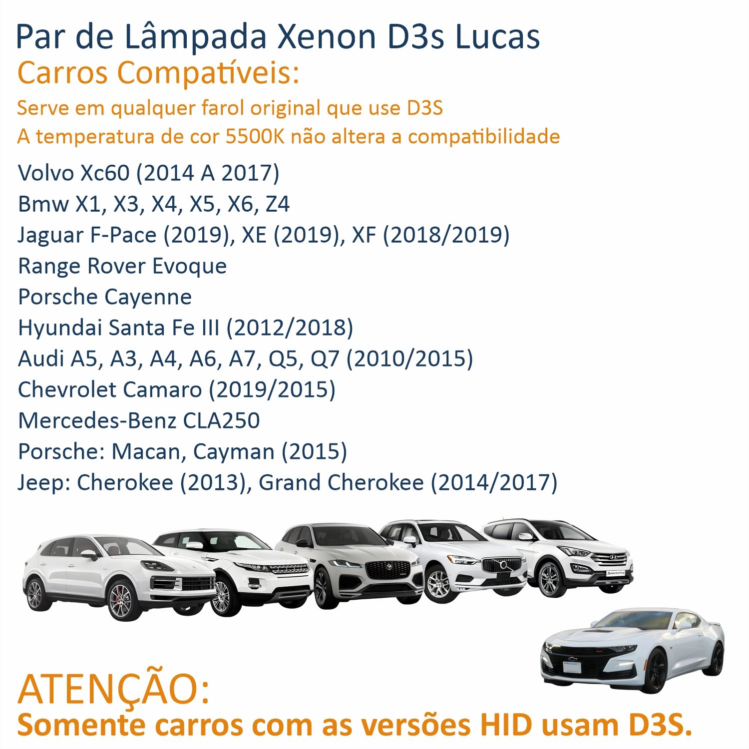 Substituição direta para veículos com faróis Xenon originais (base D3S, 35W). Proporciona iluminação branca intensa de 5500K, maior visibilidade e segurança. Compatível com diversas marcas e modelos que utilizam encaixe D3S de fábrica.